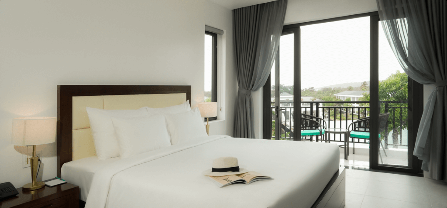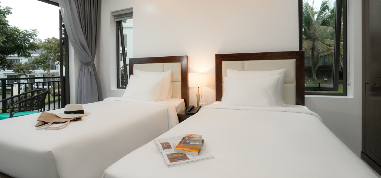 Premium Deluxe hướng hồ bơi (Premium Deluxe Pool View) Diện tích: 43m2 Hướng Biển Phòng dành cho 02 người lớn và 02 trẻ em Phòng có 1 giường đơn hoặc phòng có 2 giường King