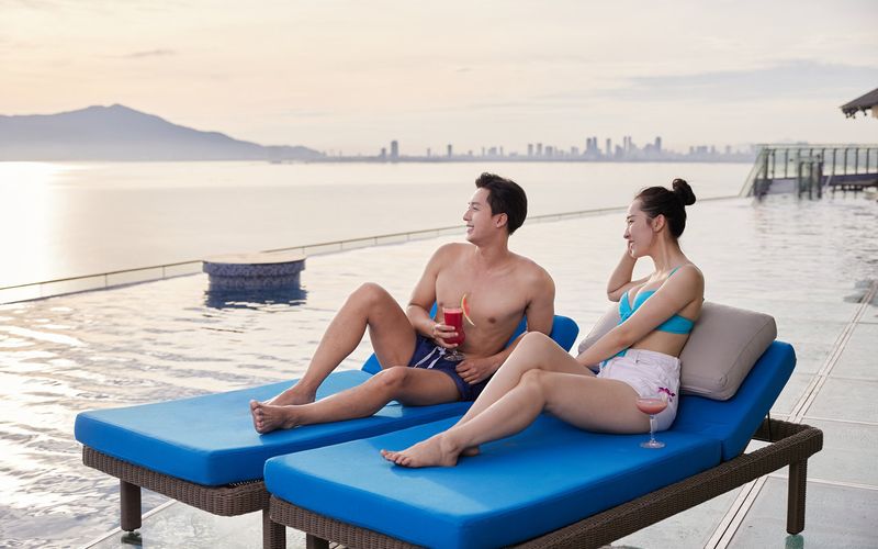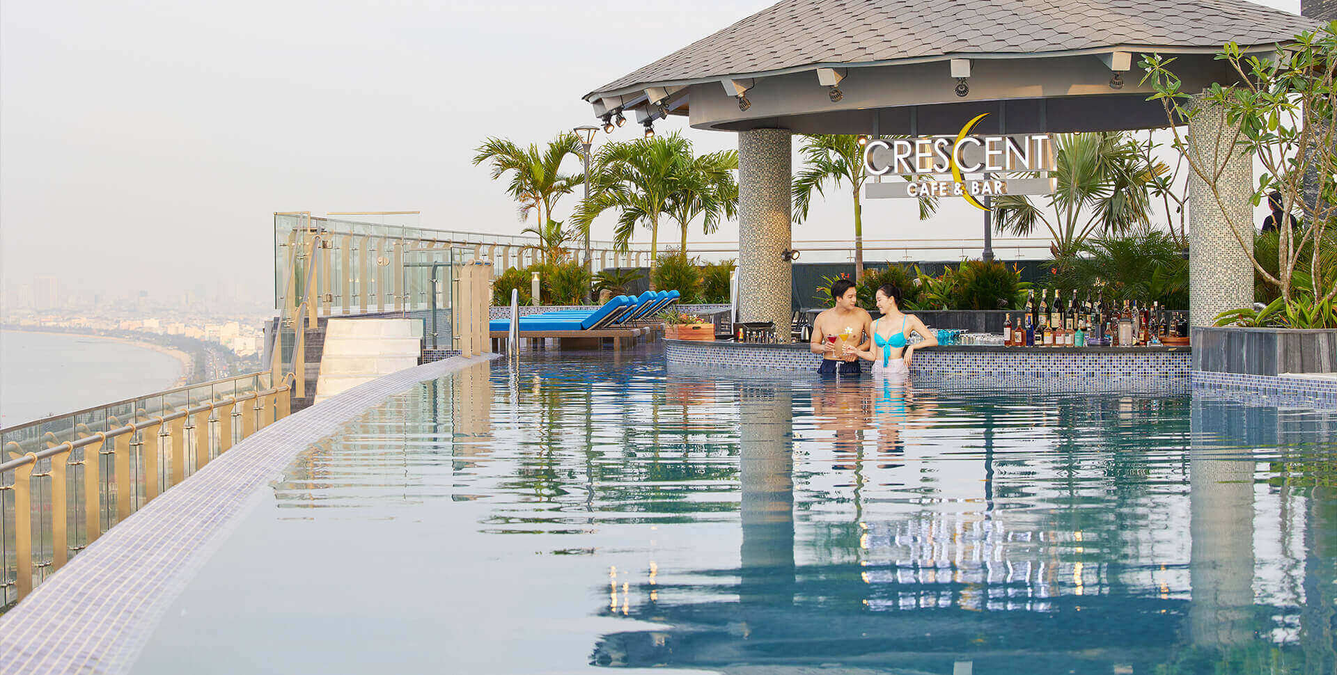 - Infinity Pool nằm trên tầng thượng 22, được chia thành 02 khu vực là khu người lớn có độ sâu khoảng 1.6 m và khu trẻ em có độ sâu dưới 1 m (có vách ngăn giữa 02 khu). Đặc biệt, hồ bơi có điều chỉnh nước ấm nên dù thời tiết lạnh Quý khách vẫn có thể thoải mái bơi được.