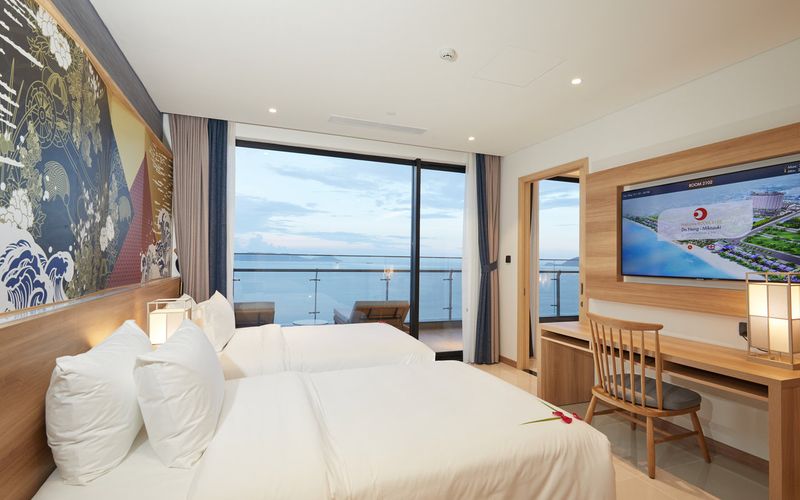 Diện tích: 85m2 Hướng Biển Phòng dành cho 02 người lớn và 02 trẻ em Phòng có 02 Giường Đơn hoặc 01 Giường King